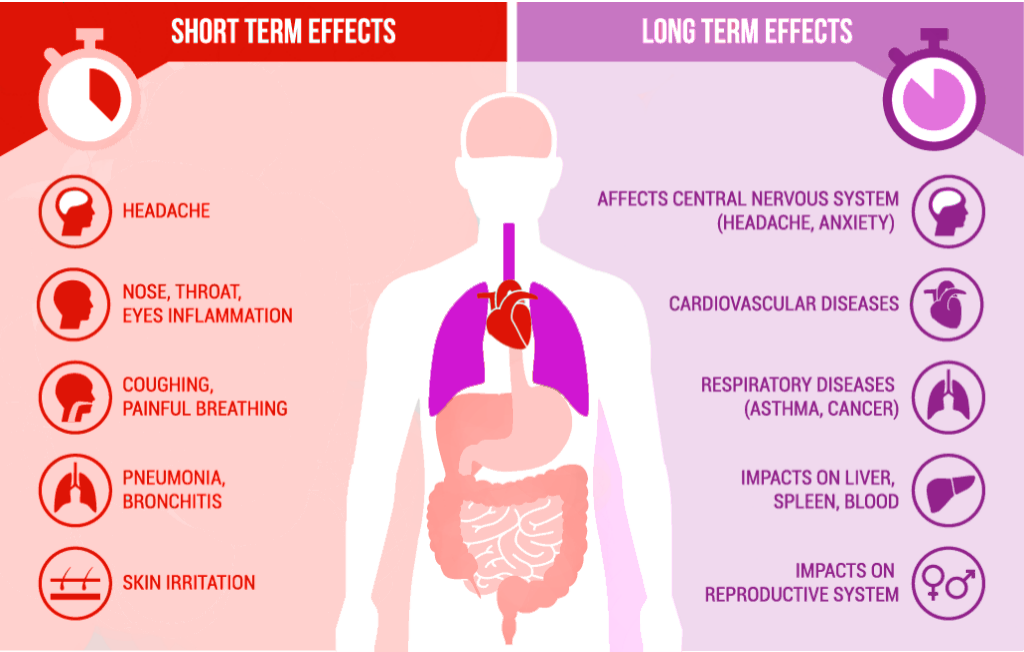 长期效应来看,会引起脏器(肺、肝脏、心脏)、皮肤、血液系统、中枢神经系统、生殖系统损伤,严重的会引起癌变。