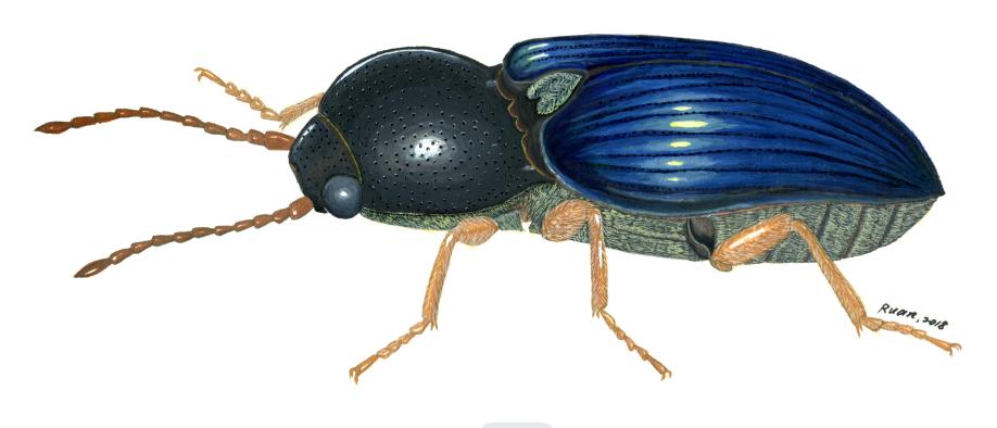 如上图所示,这是裂爪叩甲属(Phorocardius)的一个未发表的种类,图中所描绘的为雌性个体,其鞘翅具有深蓝色的金属光泽,十分夺目;其体表覆盖着密集的金黄色毛被,较为特殊。叩甲是一类十分喜欢弹跳的昆虫,俗称叩头虫、磕头虫。小孩们经常把它们捏在指间让其咔嚓咔嚓地“叩头”,或不断将其反置于地面,让它们以弹跳来翻转虫体。叩甲隶属于鞘翅目、叩甲科,全球已知1万余种, 中国已知逾1500种,具有丰富的物种多样性。(创作者:阮用颖)
