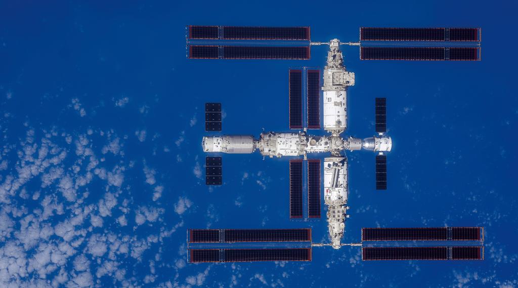 2023年11月28日,中国载人航天工程首次对外发布由神舟十六号乘组返回地面前手持高清相机,通过飞船绕飞拍摄的空间站组合体全景照片。(中国载人航天工程办公室供图)