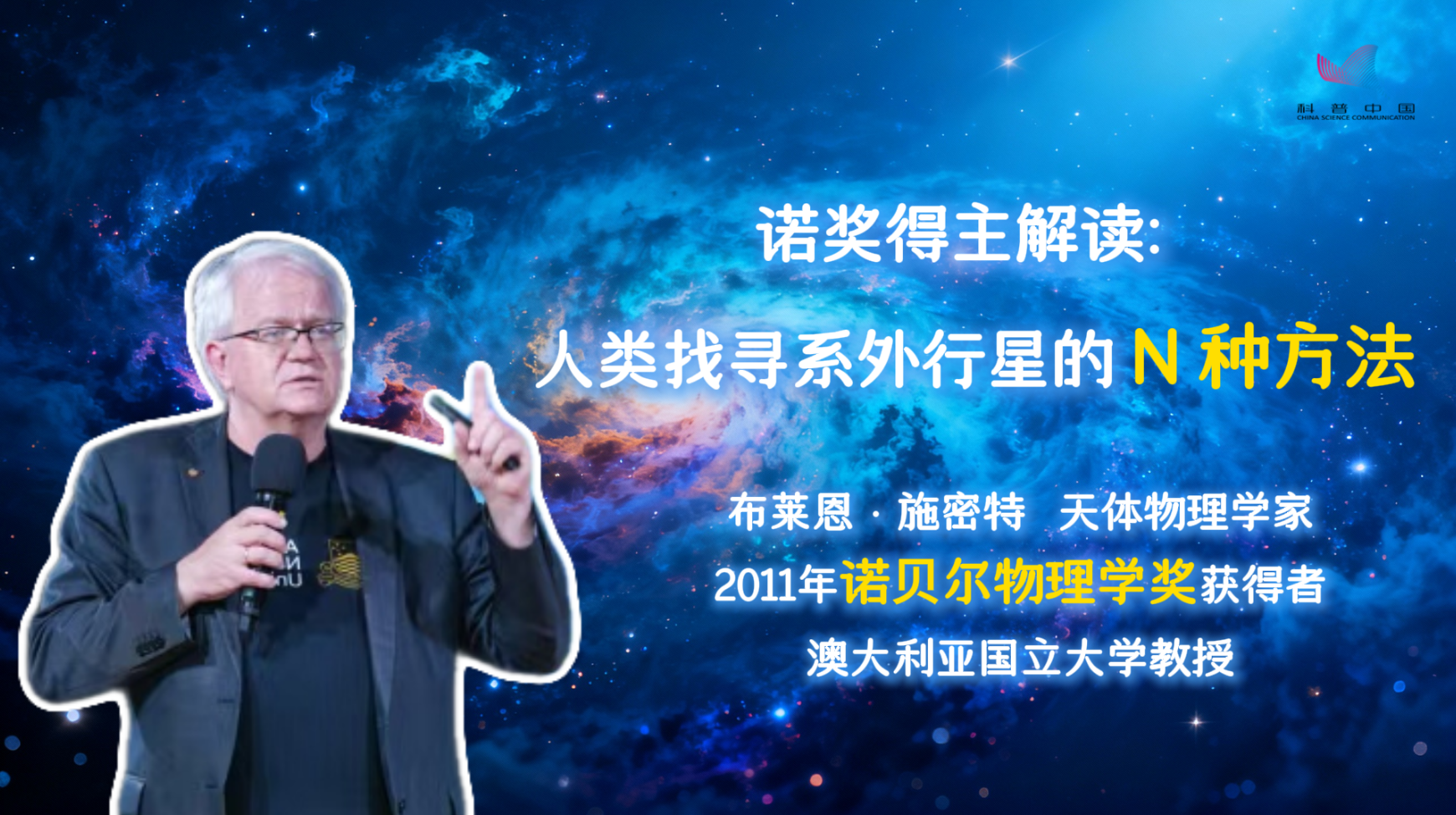 布莱恩·施密特,2011年诺⻉尔物理学奖获得者、澳⼤利亚官佐勋章获得者、澳⼤利亚科学院院⼠、英国皇家学会院⼠、澳大利亚国立大学教授。布莱恩·施密特因通过观测遥远超新星发现宇宙加速膨胀现象,与索尔·珀尔马特、亚当·里斯共同荣获2011年诺贝尔物理学奖。