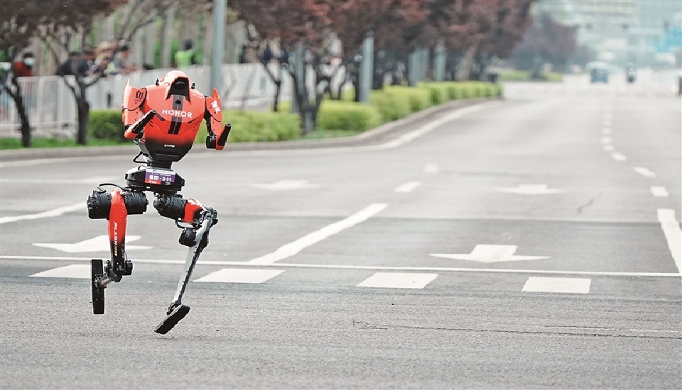 2026北京亦庄人形机器人半程马拉松比赛中,机器人选手在奋力奔跑。记者 王清彬摄/光明图片