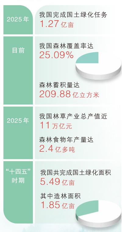 记者从全国林业和草原工作会议上获悉:2025年,我国完成国土绿化任务1.27亿亩,其中营造林5345万亩,退化草原修复治理7390万亩。目前全国森林覆盖率达25.09%,森林蓄积量达209.88亿立方米,绿色发展底色成色更加鲜明。