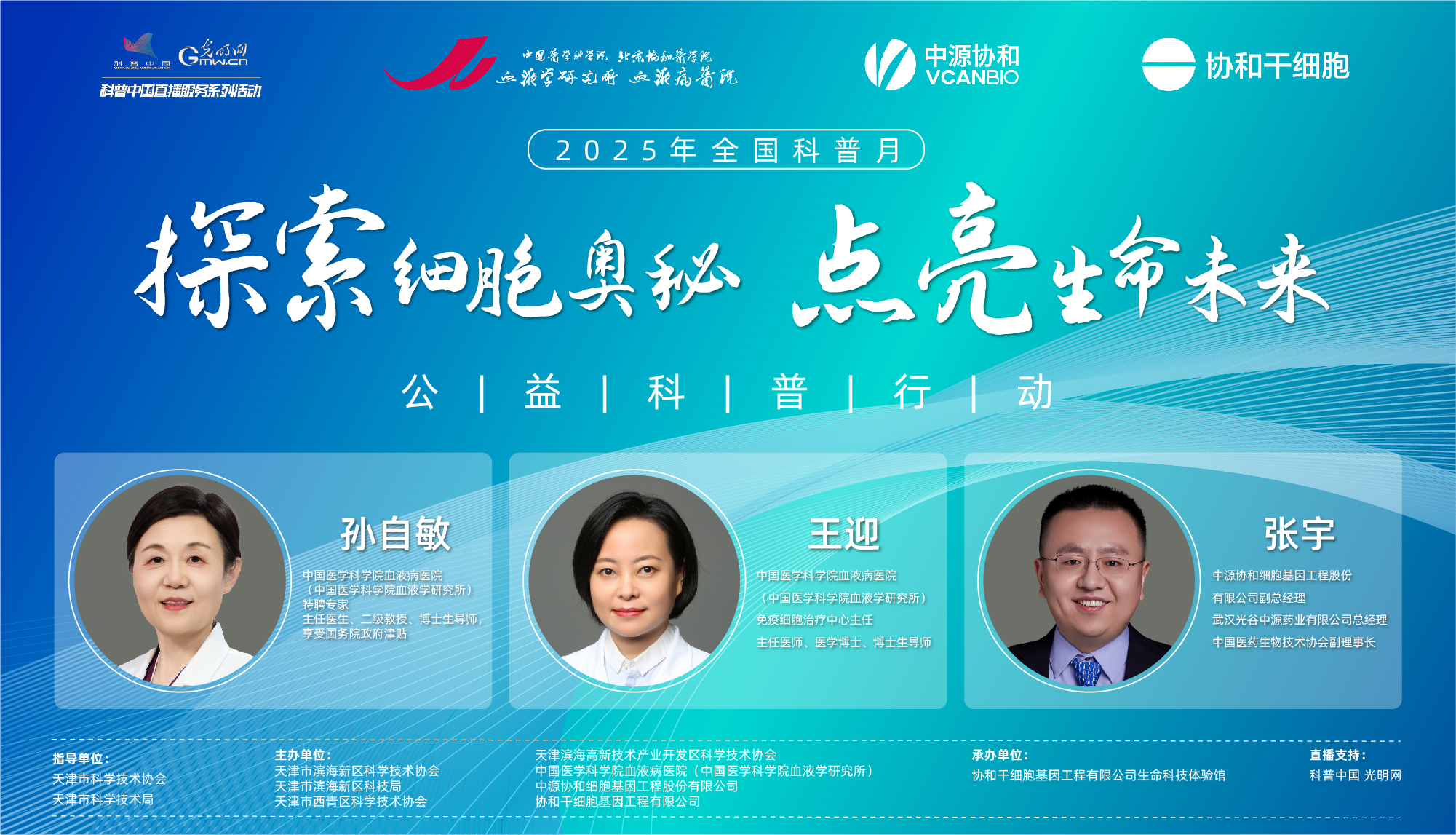 直播将围绕“脐带血造血干细胞移植”“免疫细胞治疗”“干细胞治疗”等话题进行科普解读,旨在提高公众对生命科学知识的认知,增强百姓科学意识,普及医学常识。直播时间:2025年9月23日15:00-16:00